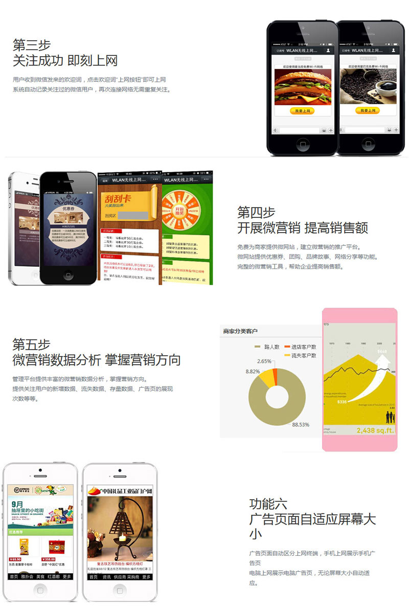 當(dāng)越來(lái)越多的企業(yè)在微信上建立公共賬號(hào)時(shí),我們可以發(fā)現(xiàn)微信以迅猛之勢(shì)滲透到我們生活中的每個(gè)角落,可以說(shuō)微信的前景被普遍看好。在此背景之下,金良網(wǎng)絡(luò)緊跟市場(chǎng)需求,推出無(wú)線wifi微信認(rèn)證功能,幫助企業(yè)更好的管理WiFi無(wú)線網(wǎng)絡(luò)以及產(chǎn)品營(yíng)銷(xiāo)推廣。 1、微信營(yíng)銷(xiāo)面臨難題 雖然微信營(yíng)銷(xiāo)方法多種多樣,但是每個(gè)企業(yè)微信運(yùn)營(yíng)者都也都將面臨一個(gè)重要難題,那就是:微信粉絲的積累問(wèn)題。企業(yè)應(yīng)以什么方式積累粉絲量?如何在積累粉絲量的同時(shí)不掉粉?怎么才能吸引粉絲自愿關(guān)注該企業(yè)公共賬號(hào)?與此同時(shí)分析粉絲的消費(fèi)能力、消費(fèi)習(xí)慣、關(guān)注熱點(diǎn)等并制定出針對(duì)性的營(yíng)銷(xiāo)策略等問(wèn)題也非常重要。 可以說(shuō),企業(yè)公共賬號(hào)的粉絲量是品牌傳播、商業(yè)推廣的基本條件,但在微信前期如何在積累粉絲量的同時(shí)又能保證不掉粉是微信營(yíng)銷(xiāo)的第一步,并且也是企業(yè)將面臨一個(gè)瓶頸性問(wèn)題,那么該如何快速收集到目標(biāo)粉絲呢? 金良網(wǎng)絡(luò)無(wú)線wifi的微信認(rèn)證上網(wǎng)功能,則為運(yùn)營(yíng)商解決了這一難題。 2、Wifi營(yíng)銷(xiāo)的飛速發(fā)展 近幾年WIFI營(yíng)銷(xiāo)這個(gè)項(xiàng)目可以說(shuō)是炙手可熱,就連移動(dòng)互聯(lián)網(wǎng)的大佬都想進(jìn)來(lái)湊個(gè)熱鬧。總體上來(lái)講,WIFI營(yíng)銷(xiāo)分為三個(gè)階段,第一個(gè)階段,是WIFI營(yíng)銷(xiāo)的初級(jí)階段,這個(gè)時(shí)候,商家認(rèn)識(shí)到了WIFI網(wǎng)絡(luò),也提供了一個(gè)免費(fèi)的WIFI信號(hào)給到客戶(hù).但是因?yàn)樽陨韺拵У膯?wèn)題,還有本身硬件問(wèn)題,導(dǎo)致客戶(hù)無(wú)法進(jìn)行良好的體驗(yàn),而且每次要咨詢(xún)店員密碼,體驗(yàn)不是很好. WIFI營(yíng)銷(xiāo)的第二個(gè)階段改良了WIFI的驗(yàn)證方式,客戶(hù)可以自助獲得上網(wǎng)密碼.另外也提供了專(zhuān)門(mén)用來(lái)支持多人上網(wǎng)的WIFI設(shè)備,所以體驗(yàn)有所提升。其主要模式是賺取第三方的廣告費(fèi)用,設(shè)備免費(fèi)給商家使用.但是從目前的情況來(lái)看,雖然它占據(jù)了大量的機(jī)場(chǎng)和快餐店鋪,但是商業(yè)模式還是值得商榷的問(wèn)題. WIFI營(yíng)銷(xiāo)的第三個(gè)階段,應(yīng)該是大數(shù)據(jù)階段,移動(dòng)互聯(lián)網(wǎng)產(chǎn)業(yè)研究院最近推出的微信營(yíng)銷(xiāo)系統(tǒng),不僅有WIFI的基礎(chǔ)功能.同時(shí)增加了線下用戶(hù)的大數(shù)據(jù)分析.為不同層次的客戶(hù),提供不同類(lèi)型的廣告展示. 3、當(dāng)微信與無(wú)線wifi相結(jié)合 大數(shù)據(jù)商業(yè)化、商品化的模式’正有望成為繼門(mén)戶(hù)網(wǎng)站、搜索引擎、社交媒體之后新一波的創(chuàng)業(yè)浪潮和產(chǎn)業(yè)革命。WIFI作為移動(dòng)大數(shù)據(jù)的入口,即將展示它最有魅力的一面。而金良wifi是一站式智能營(yíng)銷(xiāo)平臺(tái),其中功能之一的微信認(rèn)證就是幫助商家微信獲得更多目標(biāo)粉絲的重中之重。在剛剛過(guò)去的一年里,金良wifi足跡遍布全國(guó)各地,在此之后,顧客如果想在景悅城內(nèi)免費(fèi)上網(wǎng),只需一鍵關(guān)注商家微信掃描二維碼即可,簡(jiǎn)單方便!這樣一來(lái),店內(nèi)客流量百分百轉(zhuǎn)化為微信粉絲量,目標(biāo)顧客迅速成為商場(chǎng)微信粉絲,后續(xù)的微信營(yíng)銷(xiāo)也就隨之順理成章。 對(duì)普通用戶(hù)來(lái)說(shuō),使用微信認(rèn)證來(lái)獲取免費(fèi)Wi-Fi服務(wù)方便快捷,不用再去詢(xún)問(wèn)是否有Wi-Fi、鏈接密碼是多少等;對(duì)于提供免費(fèi)Wi-Fi的商家而言,此舉可減少客服人員的工作量,大大節(jié)省工作人員時(shí)間成本,并輕松獲取大量的目標(biāo)粉絲,實(shí)在是一舉兩得之好事。 |